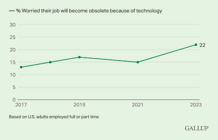 Fear of becoming obsolete (FOBO) is on the rise among U.S. workers, driven by the increasing capabilities of artificial intelligence (AI). A recent Gallup poll found that 22% of workers now worry that technology will make their job obsolete, up from 15% in 2021. This is the highest level of FOBO since Gallup began tracking the trend in 2017.